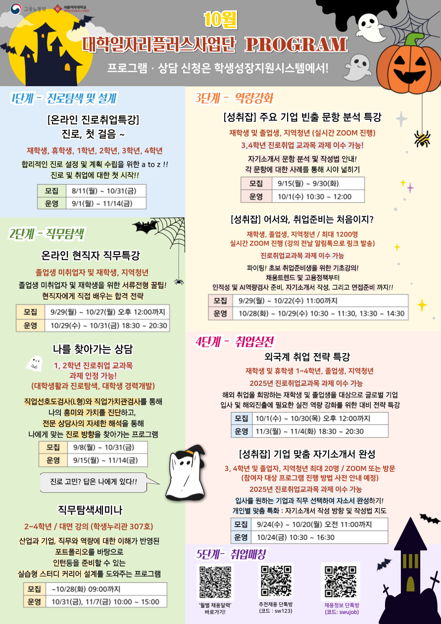 대학일자리플러스사업단에서 2025년 10월 운영 예정인 진로·취업 프로그램 포스터를 첨부와 같이 안내하오니, 많은 관심과 참여 부탁드립니다.